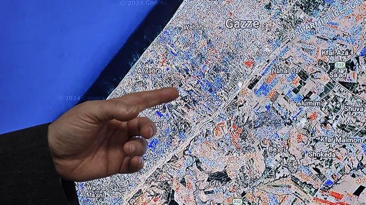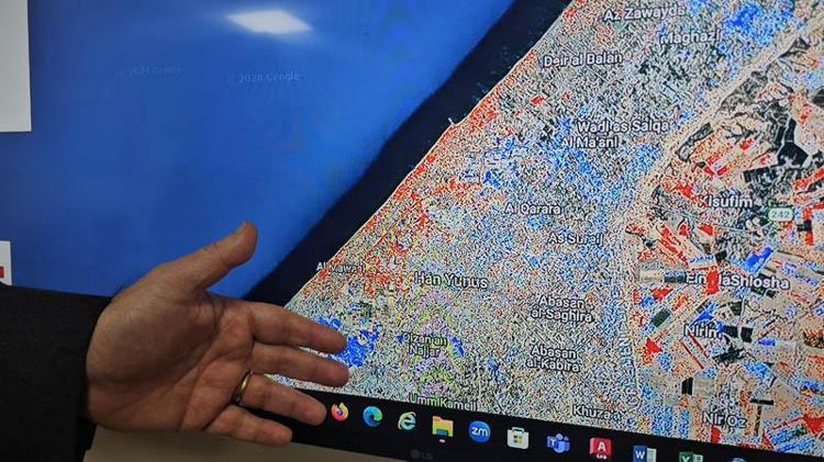 Ama Gazze Şeridi’ne geldiğimiz zaman mavi ile görülen bölgeler daha önce orada olan yollar, binalar, hastaneler hasar görmüş. Kırmızı alanlar, insanlar, mavi alanlardaki hasarlı yerlerden ayrılıp kıyı şeridinde toplanmış gibi görünüyor. Han Yunus’un hemen alt tarafında, kentsel alanda önemli bir tahribat dikkat çekiyor” ifadelerini kullandı.