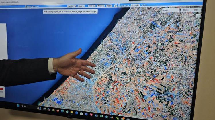 Haritada, yerleşim yerlerindeki değişimlere dikkati çeken Prof. Dr. Kutoğlu, “Maviler zamanında olup da şimdi olmayan kütleleri, kırmızılar yeni oluşan kütleleri gösteriyor. İsrail tarafında tarımsal faaliyet yürütülen alanlar var. Kırmızılar büyümüş bitkileri; maviler biçilmişleri gösteriyor.