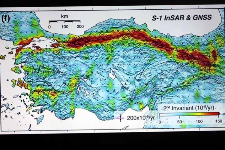 Türkiye'nin 3 büyük tabaka arasında kaldığı için deprem tehlikesi taşıdığını belirten Zonguldak Bülent Ecevit Üniversitesi Rektör Yardımcısı ve Geomatik Mühendisliği Bölümü Öğretim Üyesi Prof. Dr. Şenol Hakan Kutoğlu, fayların stres haritalarını göstererek, kırmızı renkli bölgelerde hızlı hareket ettiğini kaydetti.