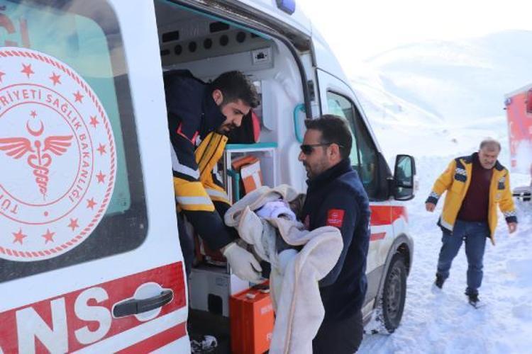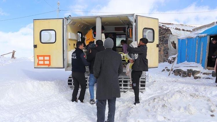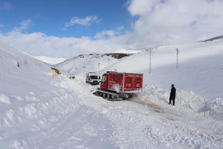 Ağrı'da kardan kapanan yolun 6 saatlik çalışma sonucu açılması ile ulaşılan hasta 4 kardeş, paletli ambulansla hastaneye götürüldü.