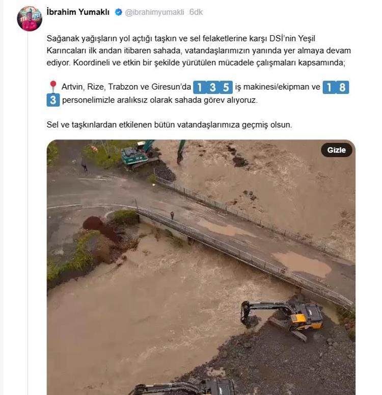 Tarım ve Orman Bakanı İbrahim Yumaklı, NSosyal hesabından yaptığı açıklamada, "Sağanak yağışların yol açtığı taşkın ve sel felaketlerine karşı DSİ’nin Yeşil Karıncaları ilk andan itibaren sahada, vatandaşlarımızın yanında yer almaya devam ediyor. Koordineli ve etkin bir şekilde yürütülen mücadele çalışmaları kapsamında; Artvin, Rize, Trabzon ve Giresun’da 135 iş makinesi/ekipman ve 183 personelimizle aralıksız olarak sahada görev alıyoruz. Sel ve taşkınlardan etkilenen bütün vatandaşlarımıza geçmiş olsun" dedi.