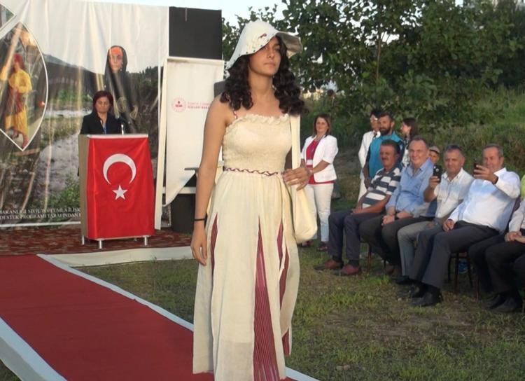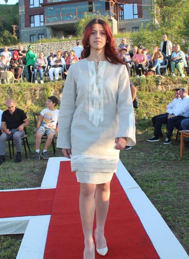 Pazar ilçesi Kız Kulesi karşısında sahil alanında düzenlenen defilede kentin tarihi kıyafetleri ile birlikte kenevirden elde edilen iplikle dokunan Rize bezinden yapılan modern kıyafetler sergilendi.