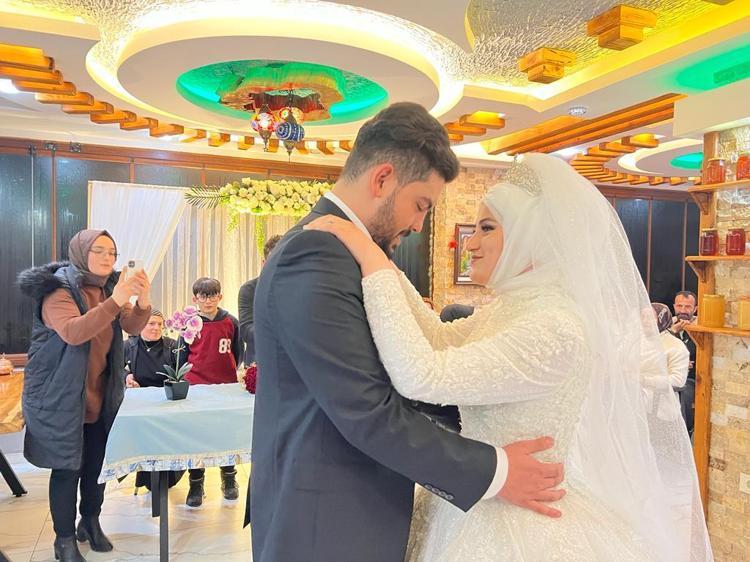 Gelinlik ve damatlık giyen çift, tulum eşliğinde girdikleri salonda dans etti. Deprem nedeniyle eğlencenin sınırlı tutulduğu düğünde katılımcılar çifti tebrik etti.