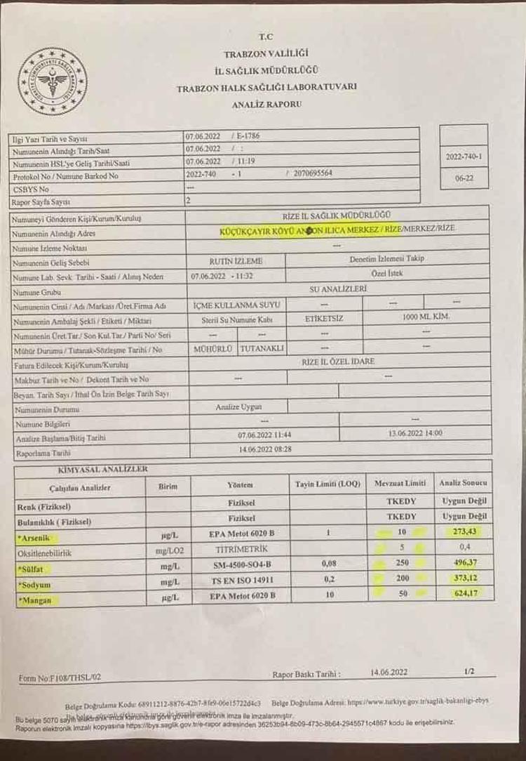 Analizlerde litrede 250 miligram olması gereken sülfat değeri de 496,37, 200 miligram olması gereken sodyum oranı ise 373,12 miligram ve 50 mikrogram olması gereken mangan oranı da 624,17 mikrogram çıktı.
