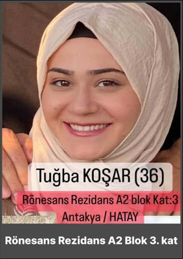 Hatay'da deprem felaketinde yıkılan Rönesans Rezidans'ta oturan öğretmen Tuğba Koşar (36) ile çocukları Mustafa Kemal (3) ile 8 aylık Mehmet Akif'e halen ulaşılamadı. Koşar'ın annesi Suna Öztürk (55), kızı ile torunlarının da aralarında olduğu kayıp 55 kişinin ismi ile fotoğraflarının yer aldığı pankart yaptırıp, evinin önüne astı. Öztürk, "Ancak hiçbir bilgi yok. Hiç kimse için bir gelişme yok. Sanki herkesin üzerinde ölü toprağı var gibi" dedi.