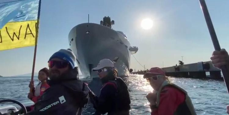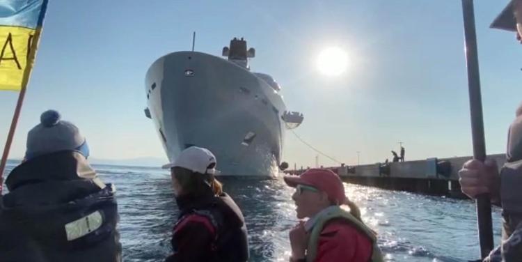 Savaş nedeniyle ülkelerine dönemeyen ve Bodrum'da bulunan Ukraynalı yelken sporcuları, Rus milyarder Roman Abramoviç'in 'My Solaris' isimli yatının ilçeye demirlemesi üzere bir bota binerek Kumbahçe açıklarına gelip, protestoda bulundu.
