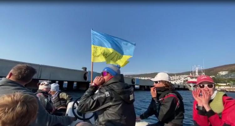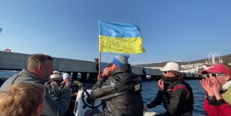 Ukrayna bayrakları açan sporcular, savaşa hayır sloganı attı. Bir süre sonra ise bölgeye Sahil Güvenlik ekipleri gelerek yelken sporcularını Sahil Güvenlik Komutanlığına götürdü. Fırat AKAY/ BODRUM (Muğla), (DHA)