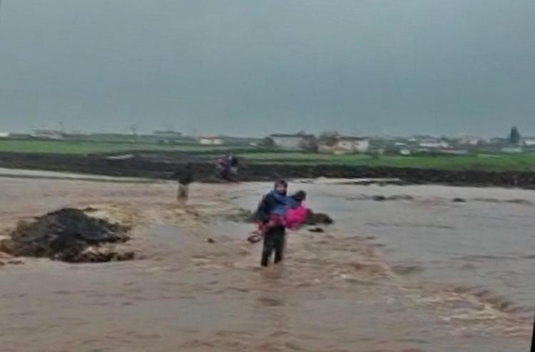 Sağanakta köprü yıkılınca, öğrencileri derenin diğer tarafına sırtlarında taşıyarak geçirdiler
