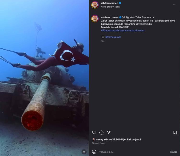 Yaklaşık 15 metre derinlikteki tanka dalış yapan Şahika Ercümen, bu anlara ait görüntüleri sosyal medya hesabında, "30 Ağustos Zafer Bayramı. Zafer, 'zafer benimdir' diyebilenindir. Başarı ise 'başaracağım' diye başlayarak sonunda 2başardım' diyebilenindir. Mustafa Kemal Atatürk" ifadeleriyle paylaştı. Ercümen'in paylaşımı kısa sürede çok sayıda beğeni ve yorum aldı.
