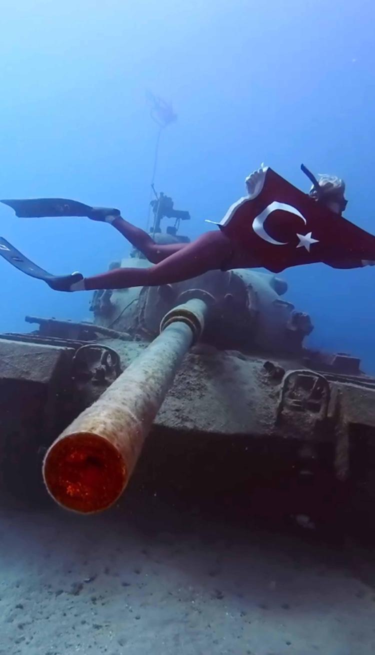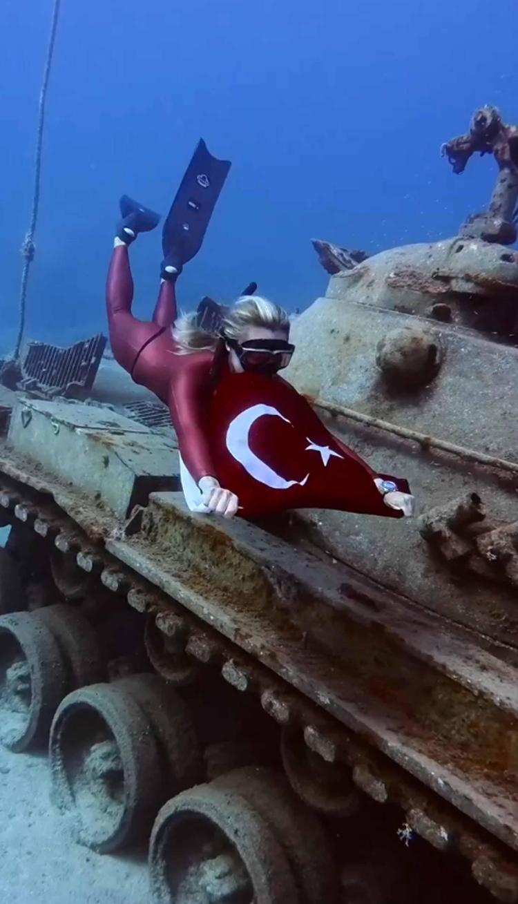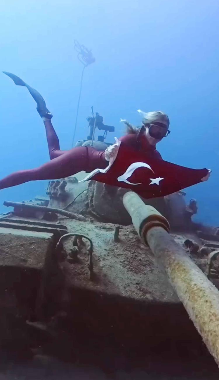 Serbest Dalış Dünya Rekortmeni milli sporcu Şahika Ercümen, Antalya'nın Kaş ilçesinde 30 Ağustos Zafer Bayramı dolayısıyla dalış yaptı. İlçedeki batık tankın bulunduğu noktada dalan Ercümen, Türk bayrağı açıp, Zafer Bayramı'nı kutladı.