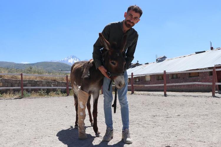 Kayseri'nin Tomarza ilçesinde sağ ön ayağındaki aksama ve sağ gözündeki görme kaybı nedeniyle sahiplerinin terk ettiği 9 yaşındaki eşek, yetkililer tarafından koruma altına alınarak tedavi edildi. Ön ayağına alçı tedavisi uygulanan eşeğe, yaşamını sürdüreceği çiftlik yönetimi tarafından 'Firuze' ismi verildi. Kafkas Atlı Spor Kulübü işletmecisi Kürşat Emir (25), "Bundan sonra burada maskot olarak, ağır bir iş görmeden hayatını devam ettirecek" dedi.
