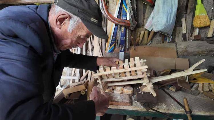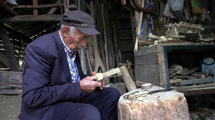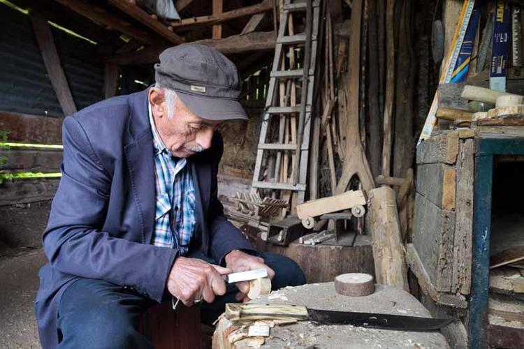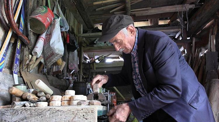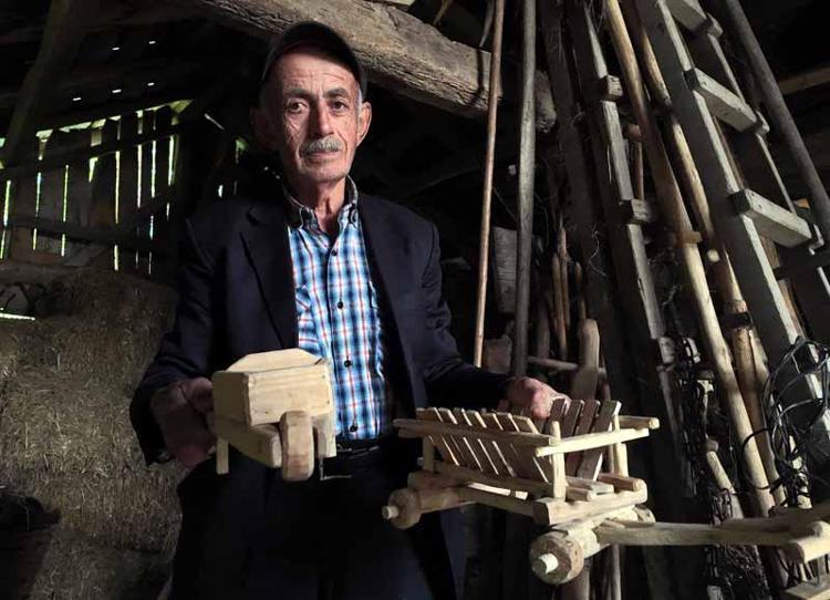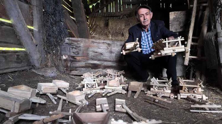 Bolu'nun Mengen ilçesinde yaşayan İrfan Sağlam (70), marangoz atölyesine çevirdiği samanlıkta tarım aletlerinin minyatürünü yapıyor.