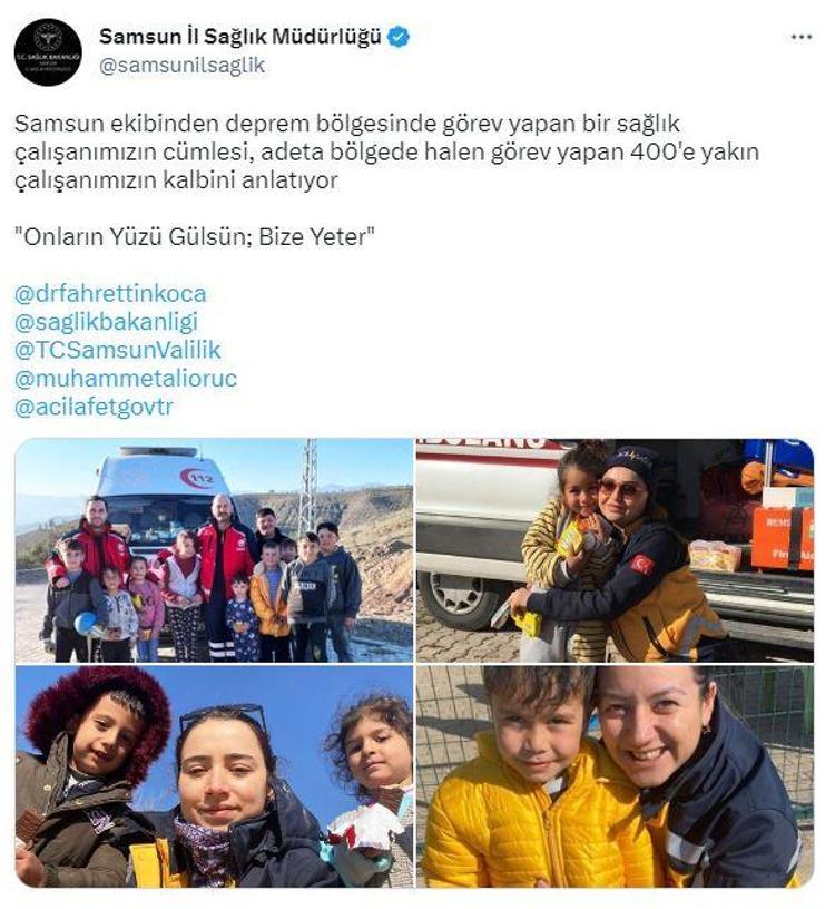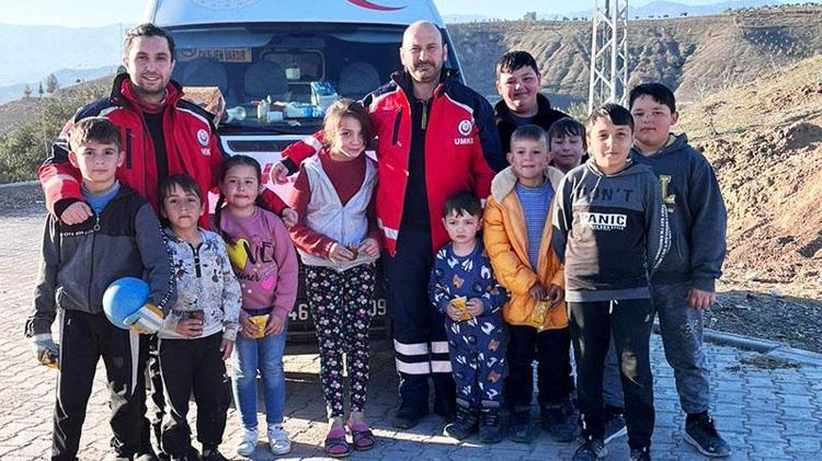 Samsun İl Sağlık Müdürlüğü'ne bağlı 112 Sağlık Hizmeti çalışanları Hatay'ın Kırıkhan ilçesinde, depremzede çocukların yüzlerini güldürüyor. Samsun ekibi, depremzedelerin muayene ve sağlık taramalarının yanı sıra, "Onların yüzü gülsün, bize yeter" diyerek çocuklara çeşitli hediyeler dağıtıyor.