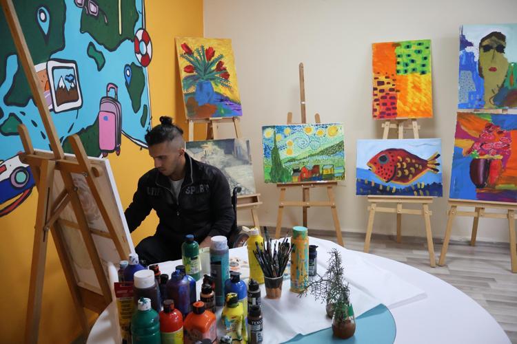 Atölye sürecini ve çalışmalarını anlatan Mustafa Gürbüz, "9 yıldan beri Uluslararası Gençlik Merkezi'nde sanat atölyesinde çalışmaktayım. Resim, heykel ve seramik gibi birçok dalda da kendimi geliştiriyorum. Burada Mehmet Deveci hocanın da çok yararı var; çizim ve boyama konusunda, çok ince detaylarda bana çok iyi yardımcı oluyor. Kendime özgü tuval, resim ve seramik gibi birçok eserim var. Ağırlıklı olarak manzara ve figüratif hayvan resimleri çiziyorum" dedi.
