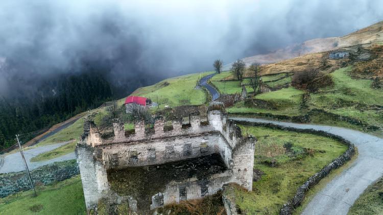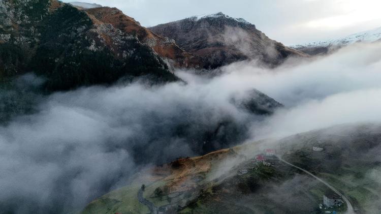 Gümüşhane'de yer alan, 17'nci yüzyılda Rum madenciler tarafından kurulduğu bilinip, tek katlı yapılar ve kiliselerden oluşan Santa Harabeleri, sonbahara sis ve bulutları arasında renk cümbüşüyle veda ediyor.