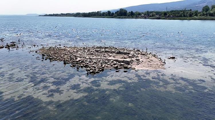 Kotun 29,70 metreye kadar gerilediği gölde, son yılların en düşük seviyelerinden biri yaşanırken gölde bulunan tarihi yapı da gün yüzüne çıktı. Daha önceki yıllarda da suyun çekilmesiyle ortaya çıkan Kartepe kıyılarına 300 metre mesafedeki yapının tarihi bir kilise kalıntısı olduğu biliniyor. Dikkat çeken manzara, dron ile görüntülendi.