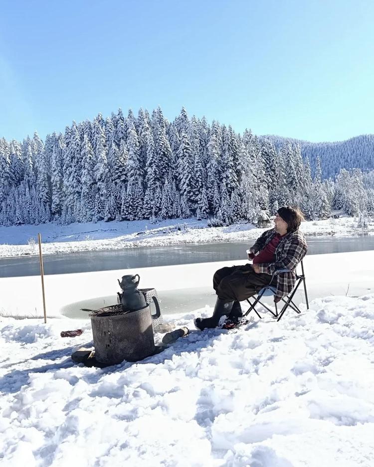 Bölgeye çıkan doğaseverler göl etrafında çay içip eşsiz manzarayı cep telefonlarıyla fotoğrafladı.