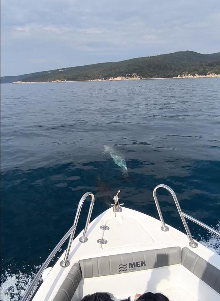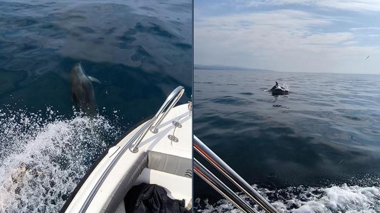 Saros’ta teknenin yanında yüzen yunuslar kamerada