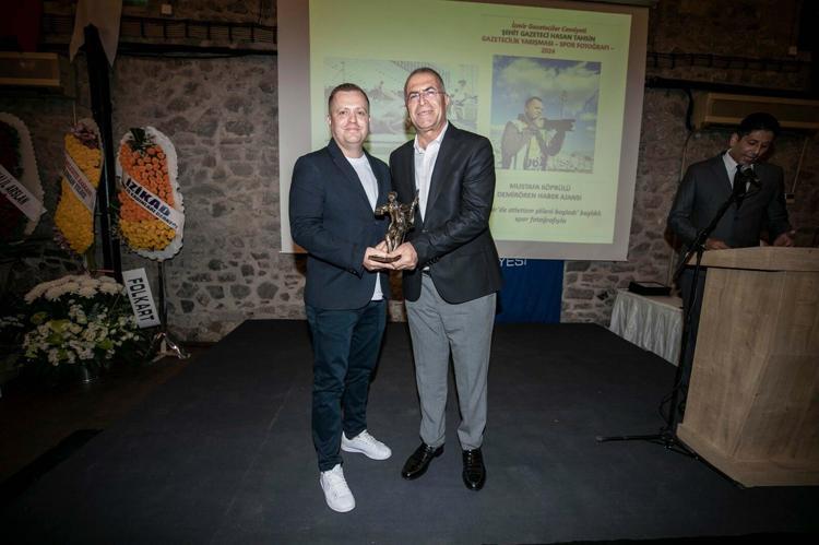 İzmir Gazeteciler Cemiyeti (İGC) tarafından geleneksel olarak düzenlenen Şehit Gazeteci Hasan Tahsin Gazetecilik Yarışması'nda 'Spor Fotoğrafı' kategorisinde birincilik elde eden Demirören Haber Ajansı (DHA) muhabiri Mustafa Köprülü, ödülünü Gaziemir Belediye Başkanı Ünal Işık'ın elinden aldı.