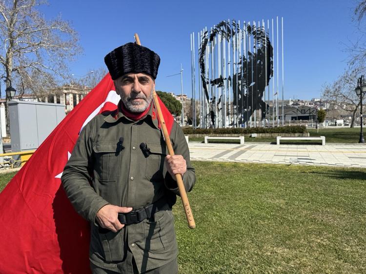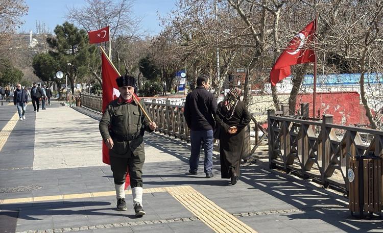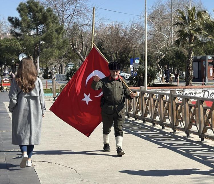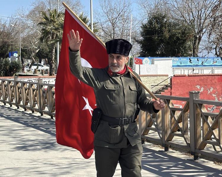 Elinde sancak ile yürüyerek Çanakkale'ye giden Saffet Gümüş, "Atalarımızın bize emanet etmiş olduğu bu toprakları, bu al bayrağı ölene kadar bir ömür boyu taşımaya çalışacağız. O ruhu gelecek nesillere taşımaya çalışacağız.