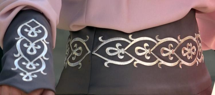 Kıyafetler, tulum ve cepken olmak üzere iki parçadan oluşturuldu. Saten kumaşa gölgeli dikiş tekniği uygulandığı kıyafetlerin tulumu şalvar formunda hazırlandı. Tulumun üzerine saten kumaş üzerine makine nakışı işlenirken, başlık metal aparatlarla süslendi.