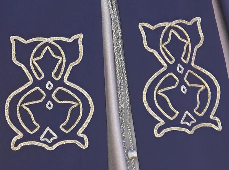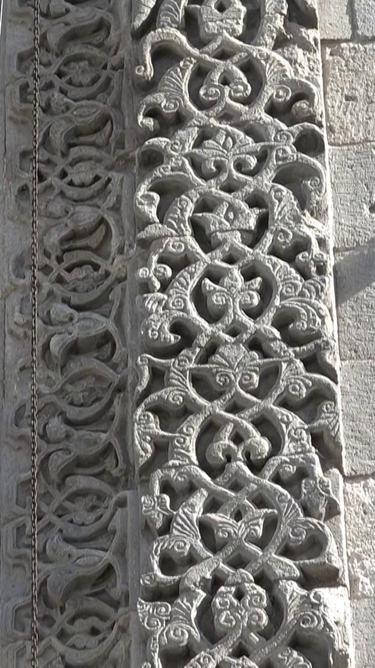 Çifte Minareli Medrese'nin girişinin sağ tarafındaki bulunan revak sütunun üzerindeki geometrik desen rumi, palmet ve lotus çiçeği motifleri kıyafetlere işlendi. Motifler, yüksek kabartma tekniği ile kıyafetlere uygulandı.