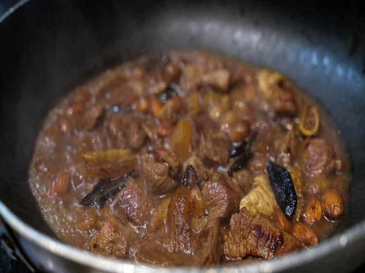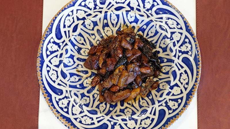 Bu saray tavamız da Selçuklu zamanında, saraylarda bir nevi ziyafet yemeği. Tatlı bir yemek adı altında bal kullandık ve içerisinde kurutulmuş meyveler kullandık. Bunlar kuzu etiyle birlikte bütün aromaları karıştırılan bir saray davet yemeğidir.