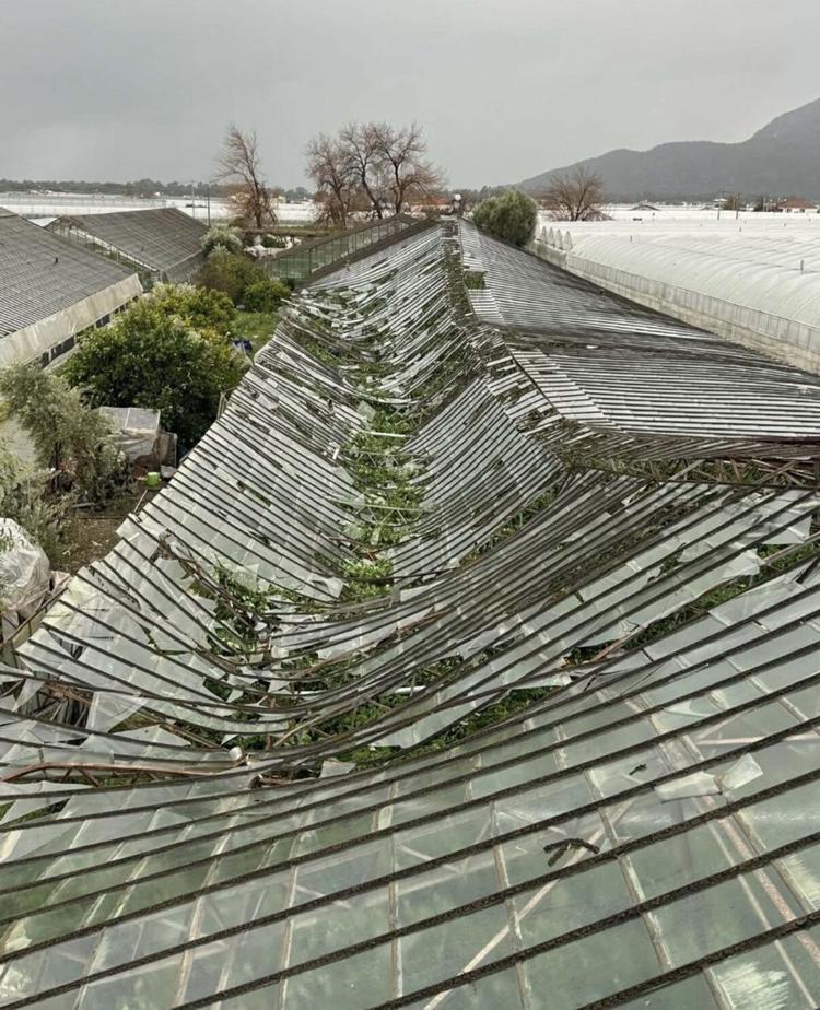 Muğla'nın Seydikemer ilçesinde etkili olan sağanak, fırtına, dolu ve hortum, tarım alanlarında büyük hasara yol açtı. Kumluova Mahallesi’nde yaklaşık 100 dönüme yakın sera zarar gördü.