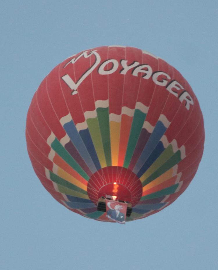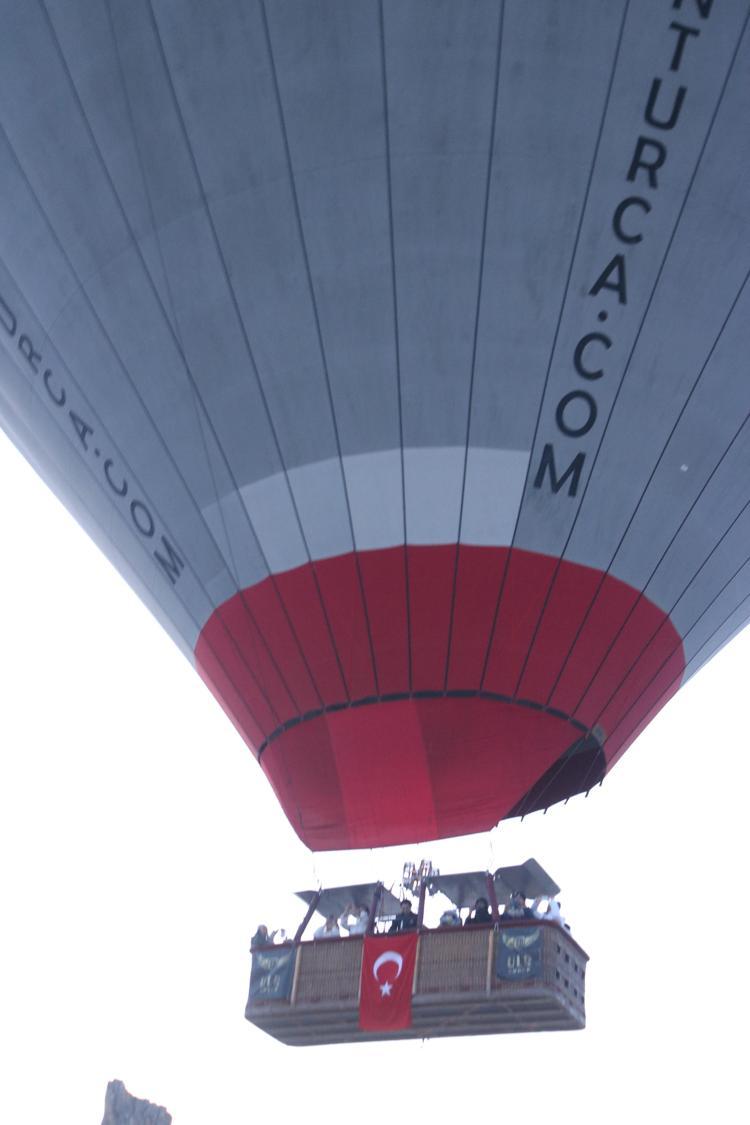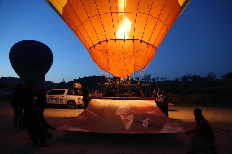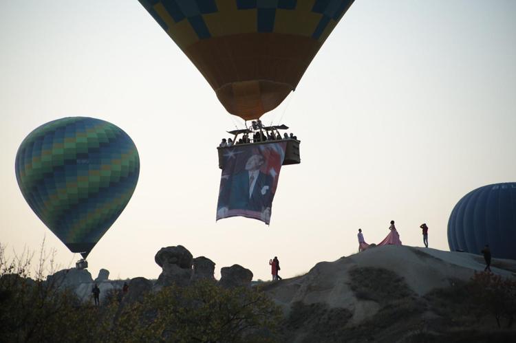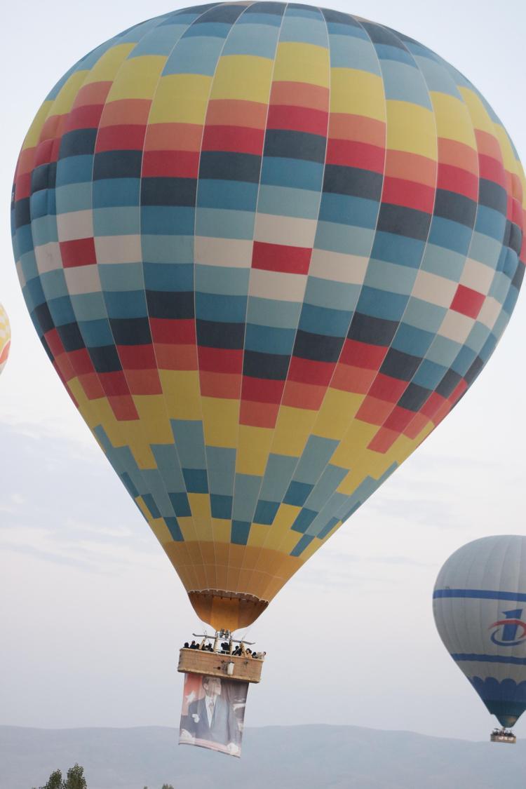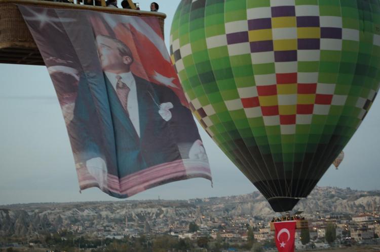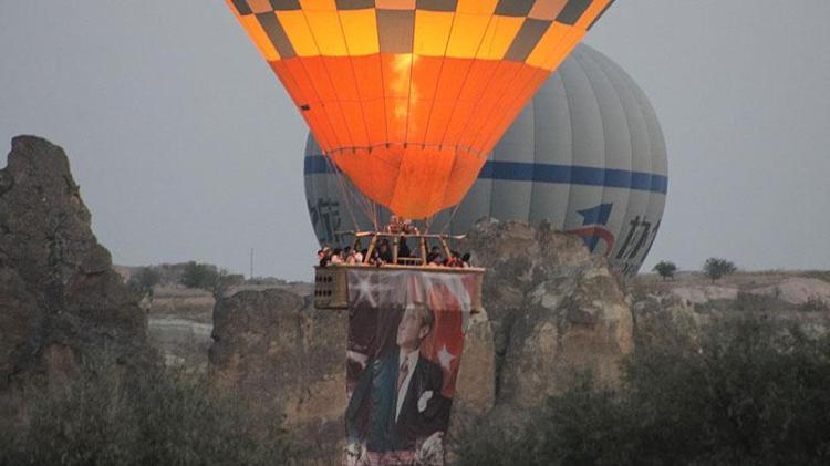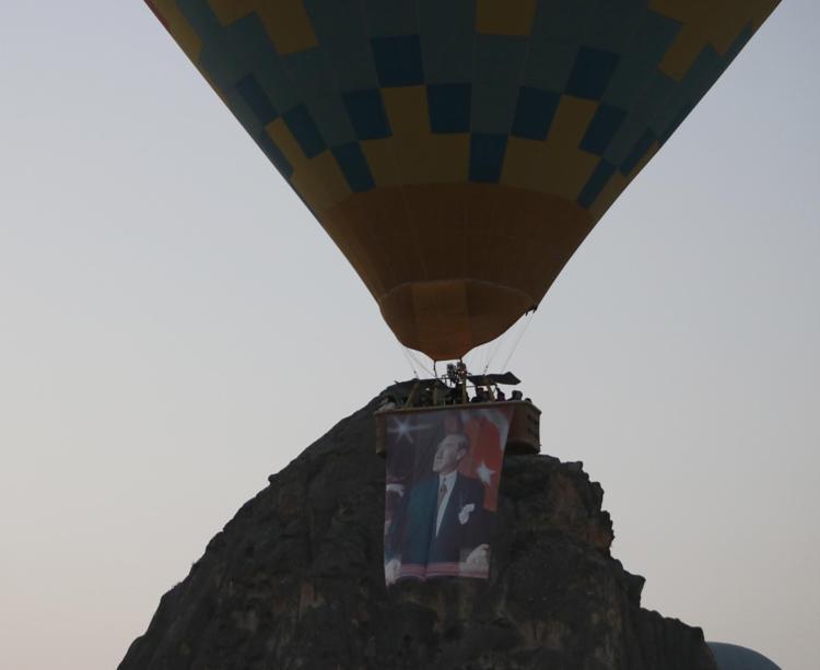 Kapadokya'da sabahın erken saatlerinde havalanan sıcak hava balonlarından bazılarının sepetlerine, Türkiye Cumhuriyeti’nin kurucusu Gazi Mustafa Kemal Atatürk’ün posterleri ve Türk bayrakları asıldı.