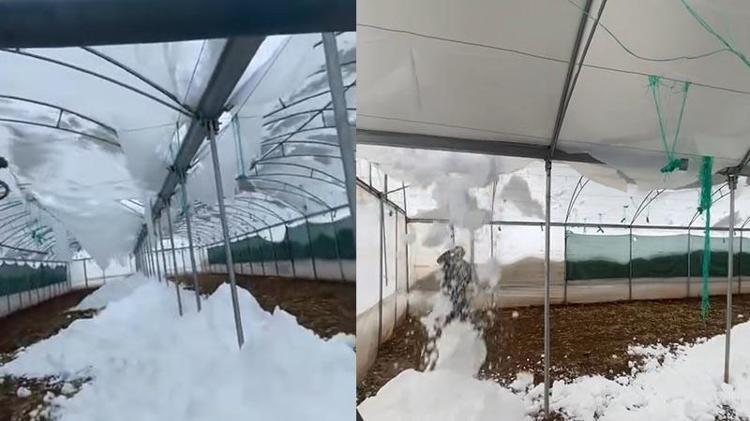 Siirt’in Baykan ilçesinde etkili olan kar yağışı nedeniyle sebze fidesi yetiştirilen seralar çöktü, cami girişindeki çatı yıkıldı.