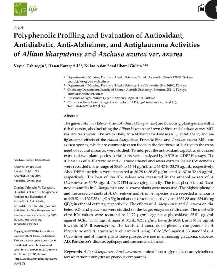 Şırnak Üniversitesi Bilimsel Araştırma Proje Koordinatörlüğü’nün desteğiyle, Dr. Öğr. Üyesi Veysel Tahiroğlu tarafından yürütülen bilimsel çalışmada, kente özgü ve doğal olarak yetişen ve halk arasında ‘Soryaz’ olarak bilinen Harput Soğanı (Allium kharputense) ve ‘Guriz’ olarak bilinen Sığır Dili (Anchusa azurea) isimli bitkilerin, Alzheimer, diyabet ve glokom hastalıklarına karşı etkili olduğu belirlendi. Bitkilerin ayrıca güçlü antioksidan özelliklere sahip olduğu da tespit edildi.