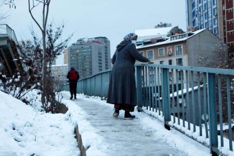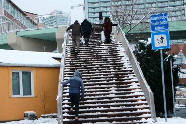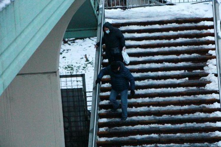 Sabah saatlerinde işlerine gitmek için üst geçitleri kullananlar tırabzanları tutarak ilerledi.