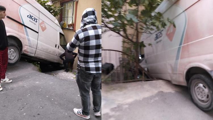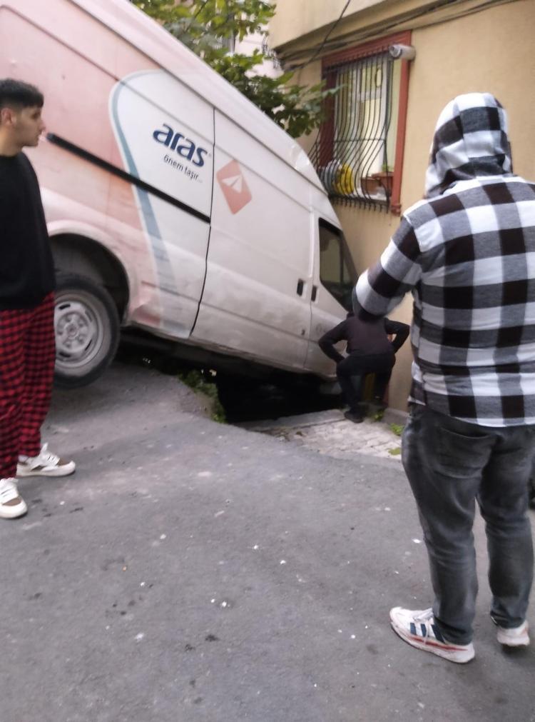 Şişli'de yokuşta bırakılan kargo aracı kayarak binaya çarptı