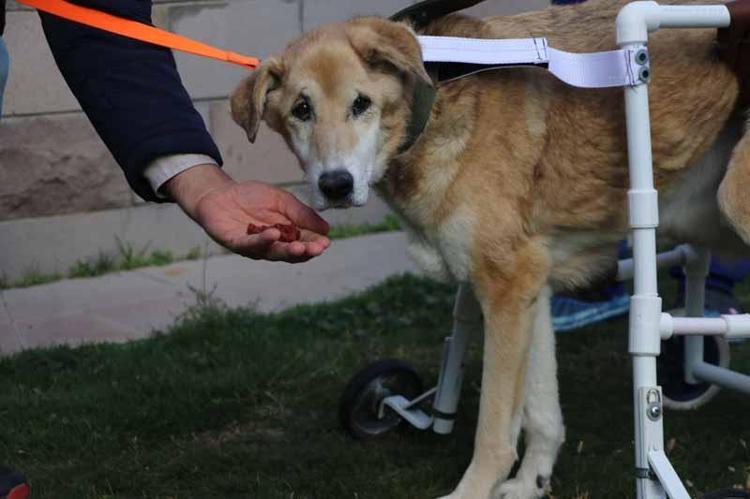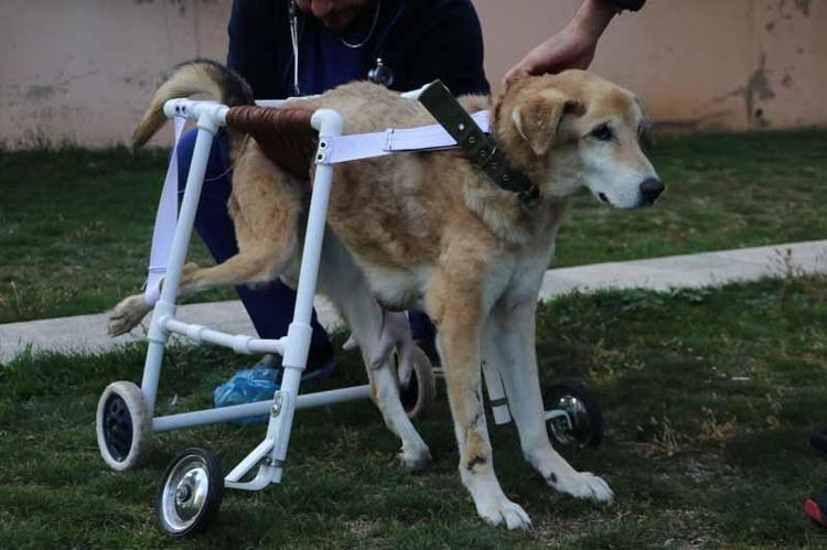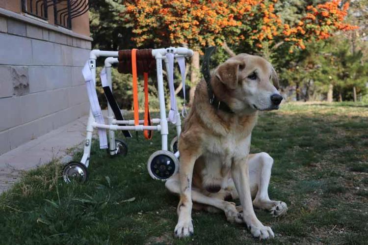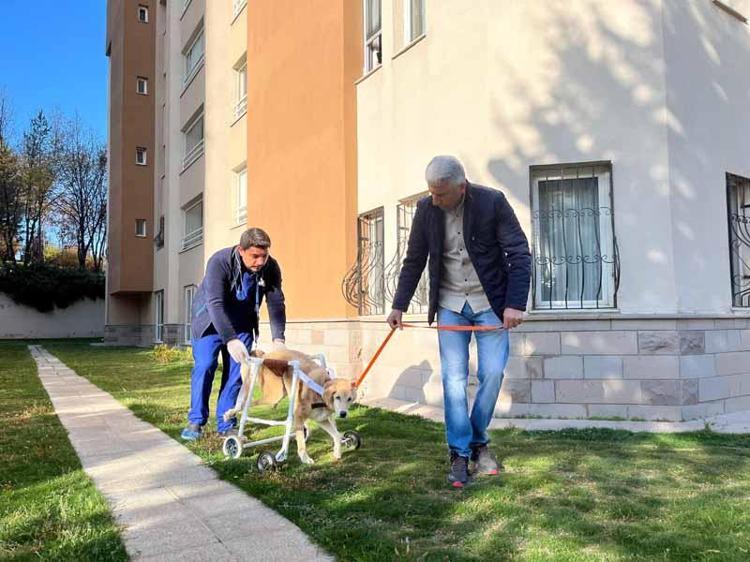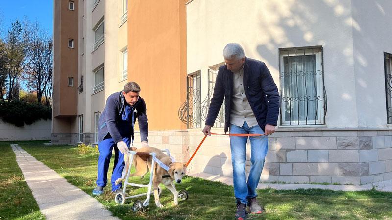 Ankara'nın Çankaya ilçesinde kansere bağlı olarak felç geçiren sokak köpeği Fıstık, 16 yıldır bahçesinde yaşadığı sitenin görevlisi Şahin Sungur'un (48) yaptığı yürüteç ile yeniden adım atmaya başladı.