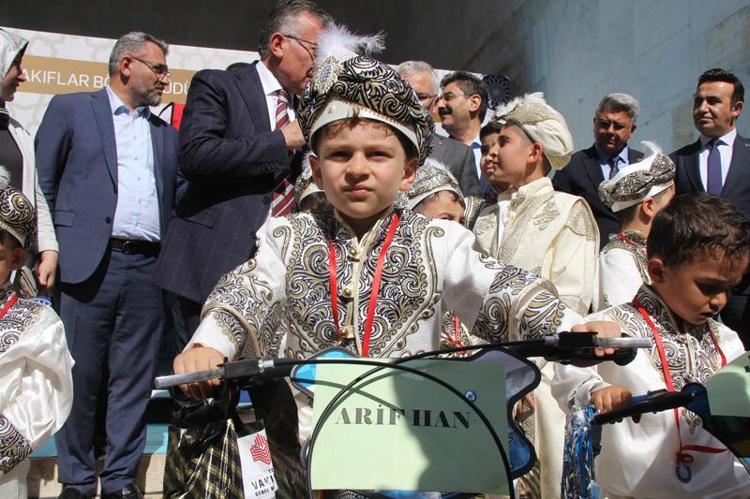 Konuşmaların ardından Vali Şimşek ve AK Parti Grup Başkanı Güler çocuklara bisiklet hediye ederek, altın taktı.