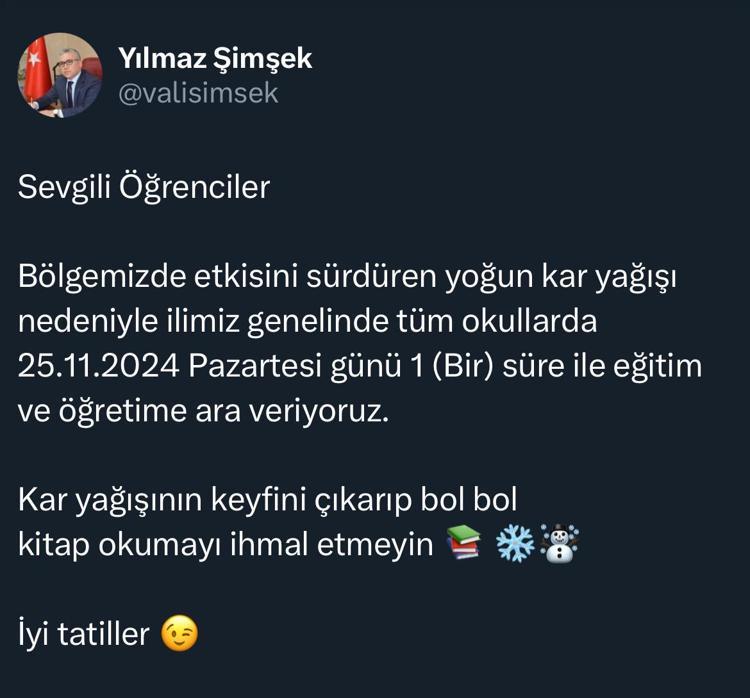 Sivas’ta kar yağışı nedeniyle yarın il genelinde ilk ve orta dereceli okullar 1 gün süreyle tatil edildi. Sivas Valisi Yılmaz Şimşek sosyal medya hesabından yaptığı duyuruda “Sevgili öğrenciler. Bölgemizde etkisini sürdüren yoğun kar yağışı nedeniyle ilimiz genelinde tüm okullarda 25.11.2024 Pazartesi günü 1 (Bir) süre ile eğitim ve öğretime ara veriyoruz. Kar yağışının keyfini çıkarıp bol bol kitap okumayı ihmal etmeyin. İyi tatiller” ifadelerine yer verdi. (DHA)