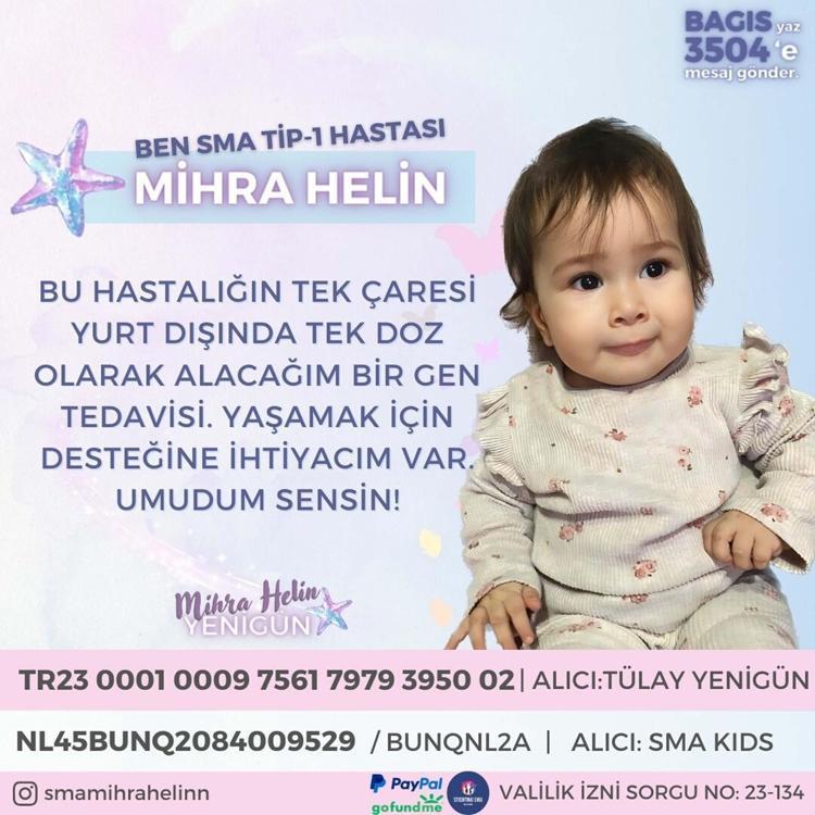 Mihra Helin'in doğumdan sonra 10 gün kuvözde kaldığını belirten Yenigün, hastalıkla ilgili tanının konulmasının ardından çaresiz kaldıklarını söyledi. İki sağlıklı çocuktan sonra dünyaya gelen Mihra'nın ellerinden kayıp gitmesini istemediklerini belirten Yenigün, "Kızımız doğduğu günden beri yaşam mücadelesi veriyor. Biz de bir yandan onun bakımıyla ilgilenirken bir yandan bağış toplayıp kızımızı gen tedavisine kavuşturmak istiyoruz. Herkesin bu konuda duyarlı bekliyoruz. Kampanyanın yüzde 29'u tamamlandı.