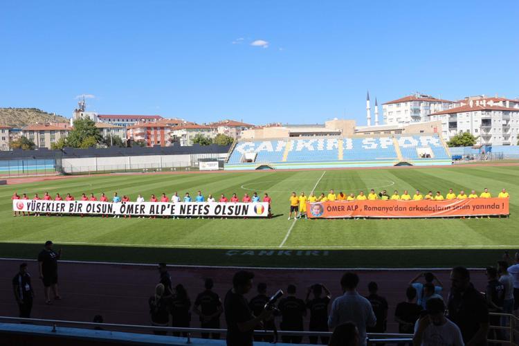Türkiye takımının 'Yürekler bir olsun, Ömer Alp'e nefes olsun', Romanya takımının ise 'Ömer Alp, Romanya'dan arkadaşların senin yanında!' pankartı ile çıktığı maçta, taraftarlar da 'Ömer Alp Yaşasın' tezahüratı yaptı.