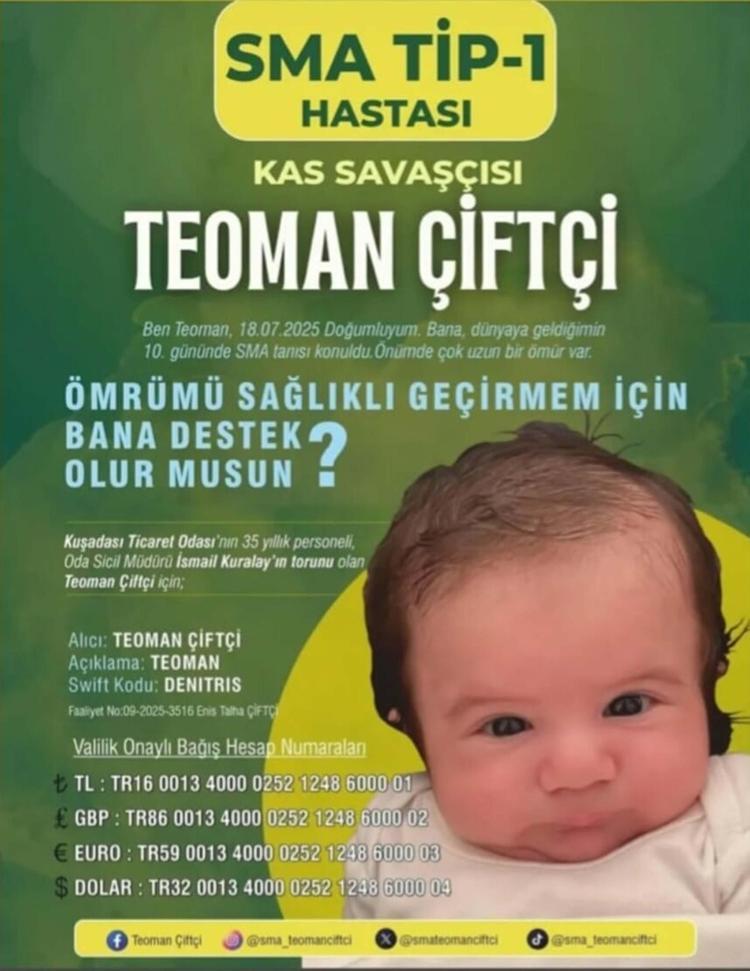 Kuşadası'nda yaşayan Yağmur-Enis Talha Çiftçi çiftinin 5 aylık bebekleri Teoman'a, doğduktan 10 gün sonra özel bir hastanede yapılan topuk kanı testinden, SMA Tip 1 teşhisi konuldu. Çiftçi çifti, yaptıkları araştırmada, SMA Tip 1 hastaları için Dubai'de uygulanan ve yüzde 95 oranında başarıya ulaşan tedavinin olduğunu öğrendi.