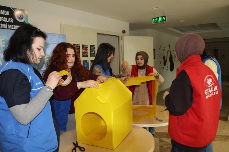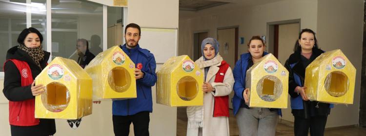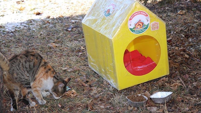 Erzurum'un Oltu ilçesinde gençlik merkezi gönüllüleri, kış şartlarından olumsuz etkilenen sokak kedileri için plastikten kedi evleri hazırladı. İlçenin farklı noktalarına yerleştirilen evlerin önlerine ayrıca mama ve su kapları da konuldu.