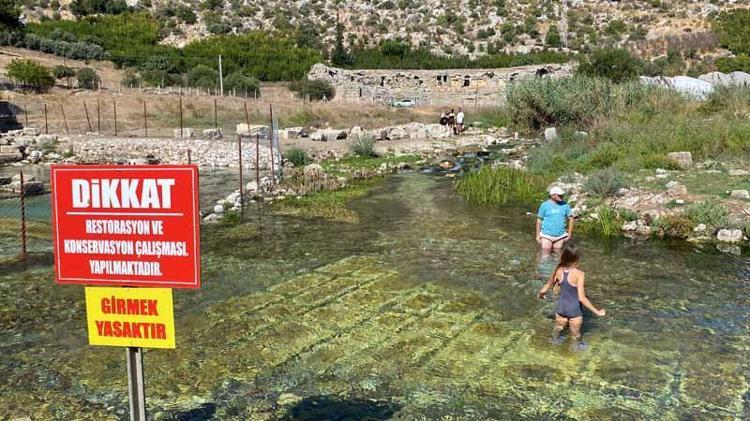 Kilisenin temelinin bulunduğu alan ise tel örgüyle kapatılıp, 'Restorasyon ve konservasyon çalışması yapılmaktadır. Girmek yasaktır' tabelası koyuldu. Antik kent ziyaretçileri, su altında kalan tarihi kalıntıların fotoğraflarını çekiyor. Tatil için bölgeye geldiklerini söyleyen Gözde Arık, "Burası çok güzel bir yer. Çok beğendik. Suya girmeyi çok istiyorduk ama yasak tabelalarını görünce vazgeçtik" dedi.