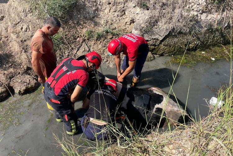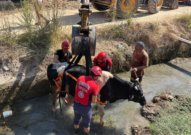 Olay, merkez Mezitli ilçesi Tece Mahallesi'nde meydana geldi. Ahırdan kaçan inek, sulama kanalına düştü. Sahibi Ercan Uz'un tüm çabalarına rağmen ayağa kalkamayan inek, kanalda sıkışıp kalınca, durum 112 Acil Çağrı Merkezi'ne bildirildi. İhbarla bölgeye Mersin Büyükşehir Belediyesi İtfaiye Dairesi Başkanlığı Arama Kurtarma ekipleri yönlendirildi. Ekipler, kepçe ve kurtarma kemeri kullanıp ortak çalışma yürüttü. Hareket edemediği için kemeri güçlükle takılan inek kurtarıldı. Kepçeyle kanaldan çıkarılan inek, sahibine teslim edildi. Çiftçi Ercan Uz, ineğini kurtaran ekiplere teşekkür etti.