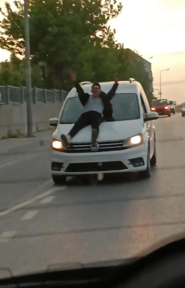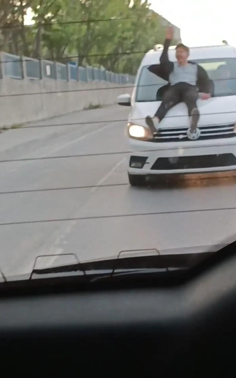 Tehlikeli yolculuk, bir başka araç sürücüsü tarafından görüntülendi. Görüntülerde, kaputun üzerinde yolculuk yapan kişinin kendisini görüntüleyen kişiye el salladığı görülüyor.