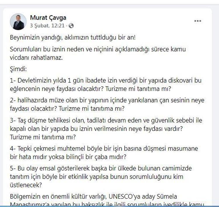 Çavga, "Sorumluları bu iznin neden ve niçinini açıklamadığı sürece kamu vicdanı rahatlamaz. Devletimizin yılda 1 gün ibadete izin verdiği bir yapıda diskovari bu eğlencenin neye faydası olacaktır?" dedi.