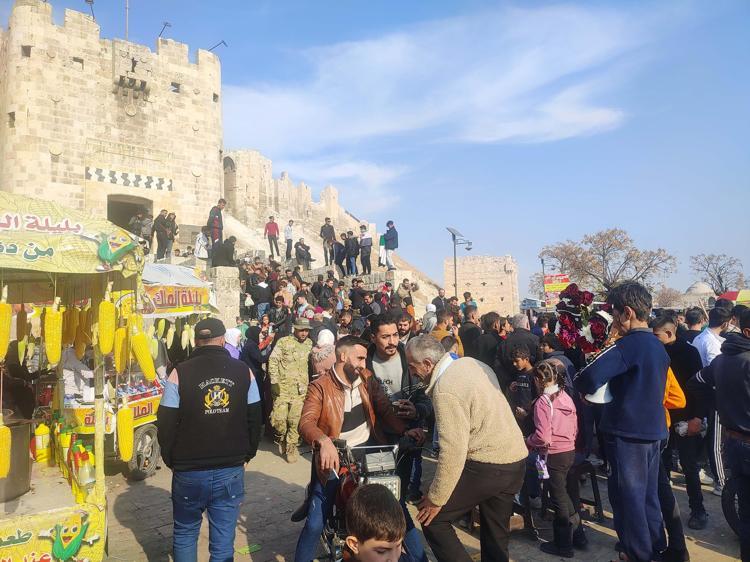 Günlerdir kutlamaların sürdüğü Halep’te, binlerce sivil Halep Kalesi önüne gelerek bol bol hatıra fotoğrafı çekip, davul zurna eşliğinde halaylar çekerek Beşar Esad ve Baas rejimi döneminin sona ermesini kutluyor.