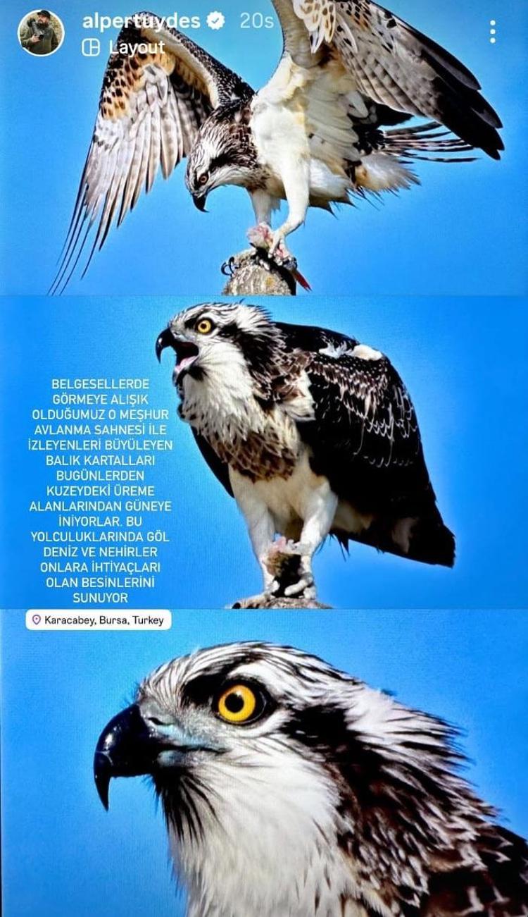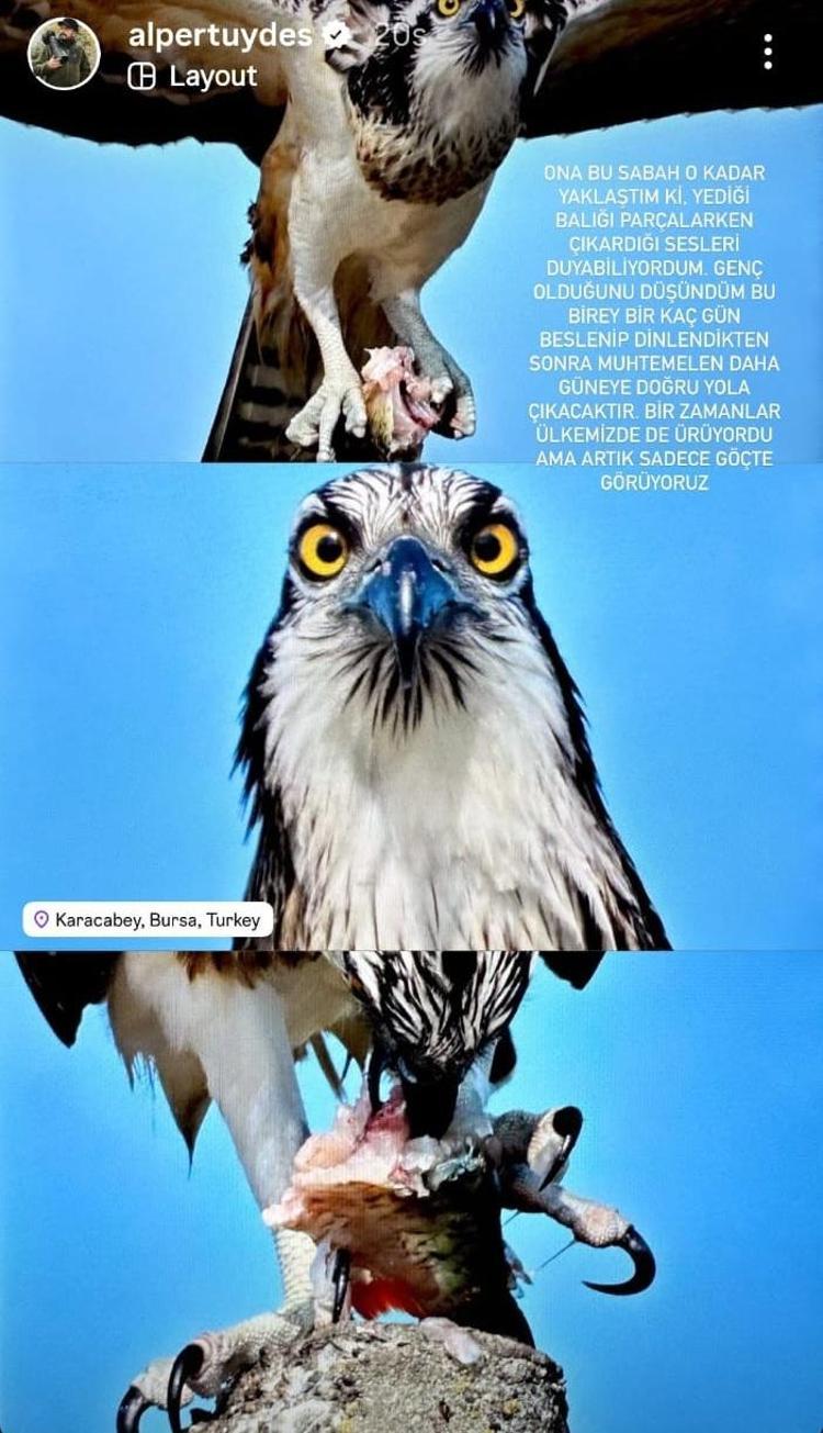 Balık kartalının avını yediği anları da fotoğraflayan Tüydeş, yaşadığı heyecanı, “Belgesellerde görmeye alışık olduğumuz o meşhur avlanma sahnesi ile izleyenleri büyüleyen balık kartalları bugünlerde kuzeydeki üreme alanlarından güneye iniyorlar. Bu yolculuklarında göl, deniz ve nehirler, onlara ihtiyaçları olan besinleri sunuyor. Ona bu sabah o kadar yaklaştım ki yediği balığı parçalarken çıkardığı sesleri duyabiliyordum. Genç olduğunu düşündüğüm bu birey birkaç gün beslenip dinlendikten sonra muhtemelen daha güneye doğru yola çıkacaktır. Bir zamanlar ülkemizde de ürüyordu ama artık sadece göçte görüyoruz” sözleriyle ifade etti.