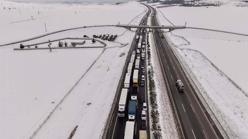 Gaziantep'te kar yağışının ardından Tarsus-Adana-Gaziantep (TAG) otoyolunda kilometrelerce araç kuyruğu oluştu. Oluşan yoğunluk dron ile görüntülendi.