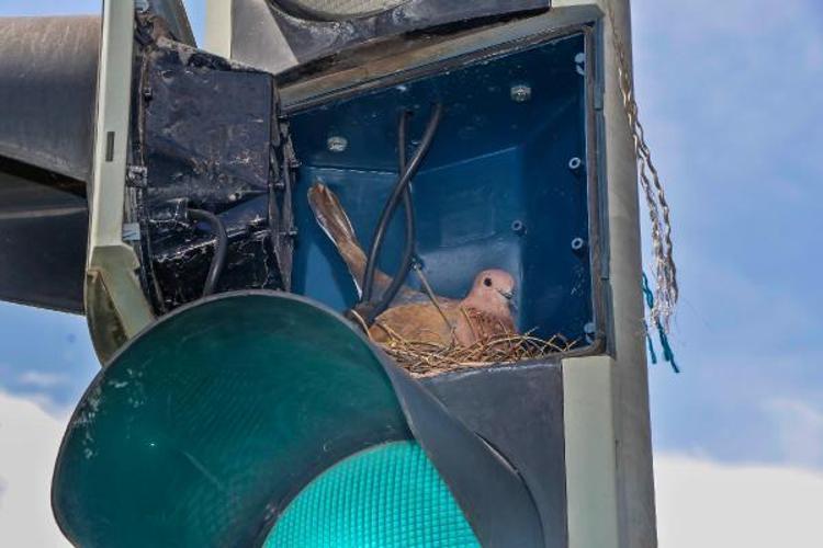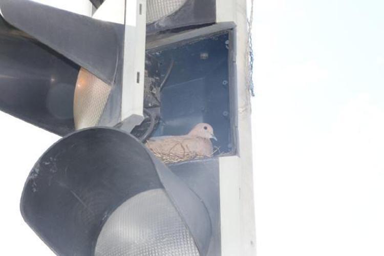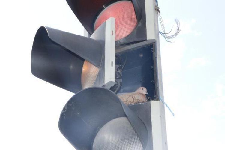 Diyarbakır'da bir kumru, kapağı açık bırakılan sarı trafik ışığına yuva yaptı. Işığı tamire gelen ekipler, kumrunun yuvasını bozmadan işlerini tamamladı. Kumru yuvadan ayrılana kadar, sarı trafik ışığı kapağı açık şekilde yanmaya devam edecek. Diclekent Bulvarı yakınında oturan Mehmet Akif Can, kumruyu görünce çok şaşırdığını dile getirerek, “Karşıdan karşıya geçerken birçok sürücünün de dikkatini çektiğini gördüm. Çok anlam ifade ediyor aslında. Anlamlı bir durum ve doğanın tahribatıyla ilgili bir mesaj aslında. İnsanlarımız doğayı tahrip ettiği için hayvanlar nerede yuva yapacaklarını pek bilmez duruma geldi” dedi.