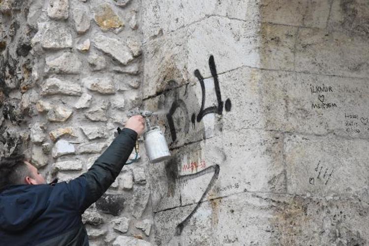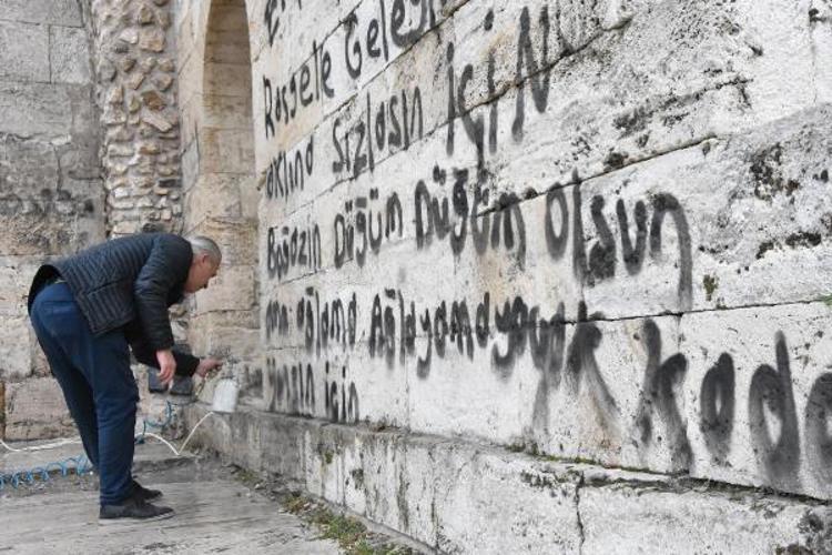 Sprey boyayla yazılan yazılar için Vakıflar Bölge Müdürlüğü tarafından çalışma yapıldı. Yazılar, tarihi yapıya zarar vermeden boya çürütme tekniğiyle silindi.