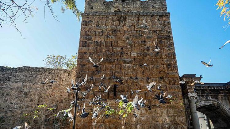 Antalya'nın simge tarihi yerlerinden Üçkapılar'a konan güvercinlerin dışkı asitlerinin yapıya zarar verdiği tespit edildi. Zarar gören yerlerin restore edileceğini belirten Antalya Valiliği Kültür Varlıkları Birim Sorumlusu Cemil Karabayram, "Kapının temizlemesine başlayacağız. Güvercinlerin gübresindeki asitle zarar görmüş" dedi.